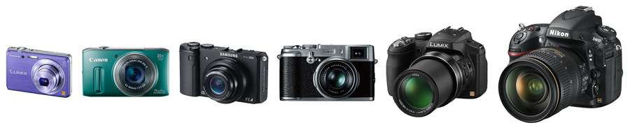 Nell’immagine qui sopra in ordine abbiamo quattro compatte, una bridge (Panasonic Lumix FZ200) e una reflex (Nikon D800). La quarta compatta è una digitale, anche se il design retrò la rende simile ad un’analogica: si tratta della Fujifilm FinePix x100.