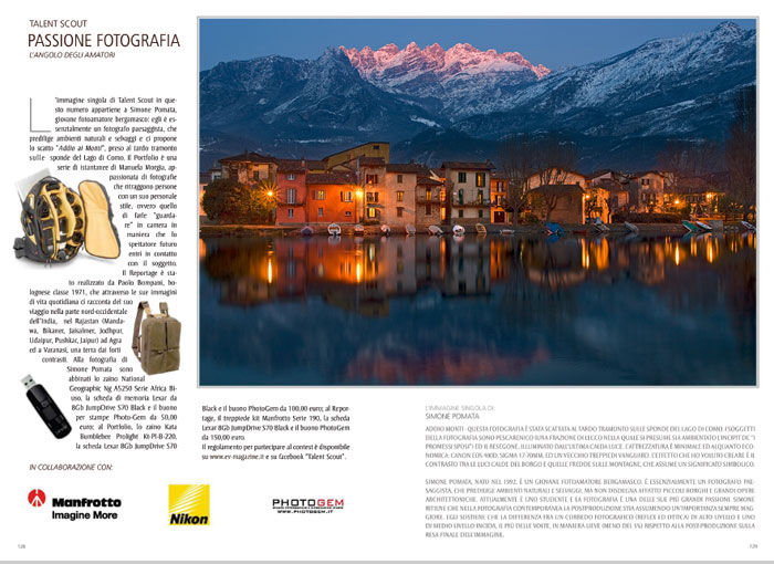 - Maggio 2012 - Concorso Talent Scout della rivista fotografica Ev-Magazine: Vincitore e pubblicazione sul numero di Maggio - Foto: Addio Monti.
